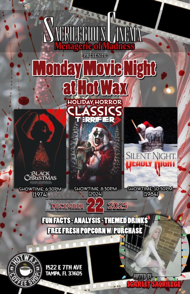 Monday, December 22nd, Sacrilegious Cinema: Menagerie of Madness amps up the fright and dives headfirst into the heavy hitters of the Christmas themed holiday horror genre we all know and love in order to usher in the upcoming festivities with this unholy triad of terror. Due to popular demand, this week boasts a triple feature, adding a newcomer to the bunch (complete with 2 killer Billy’s in the quintessential classic duo), perfecting the lineup with different decades of seasonal scares to rouse your spirits. ![]()