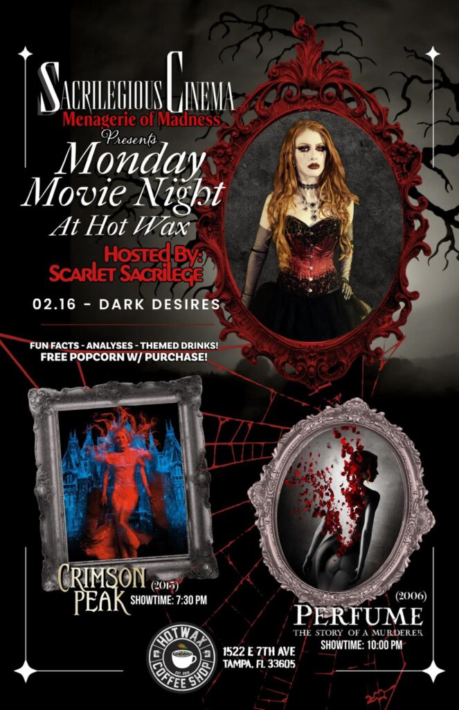This Monday, February 16th, Sacrilegious Cinema: Menagerie of Madness harkens back to gothic horror in this debonair dyad. If you’re still reeling from Valentine’s Day and need to satiate a hunger for more dark romance, this pair will taint your system with twisted intimacy, exploring infatuation, sordid desires, old wounds, selfhood and the inevitable relationship between love and death- set against intricate backdrops and exquisite sights riddled in morbid mystique and dripping in sinful sensuality. ![]()
