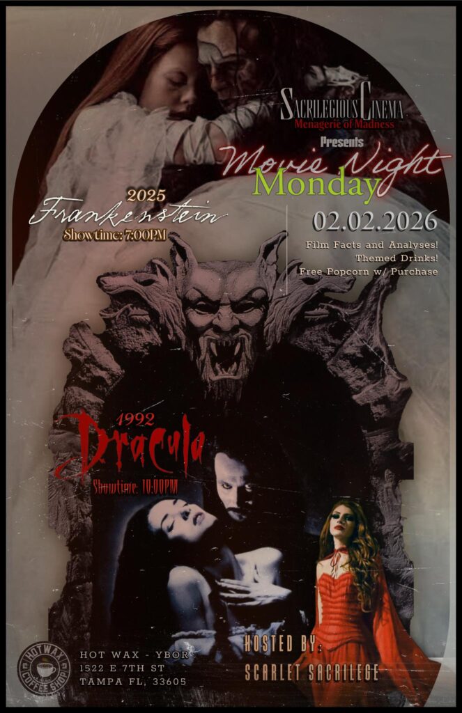 In this entry of Sacrilegious Cinema: Menagerie of Madness, we unravel February with Frankenstein and Dracula aboard, analyzing pulses of passion amid notions of rebirth and the dual nature intrinsic to humanity, with emphasis on the excess in ocular storytelling to guide our aching hearts with an examination of gothic horror in its finest form. Come out to Hot Wax Ybor and succumb to seduction and receive a lesson in yearning. ![]()